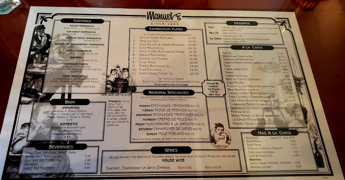 Introducing the menu at Manuel's Mexican Restaurant, located at 261 Center Ave in Aptos, CA, promises a delightful taste of traditional Mexican cuisine. With standout regional specialties like Enchiladas Mexicanas on Mondays and Huachinango A La Jarocha on Fridays, you can savor unique flavors throughout the week.